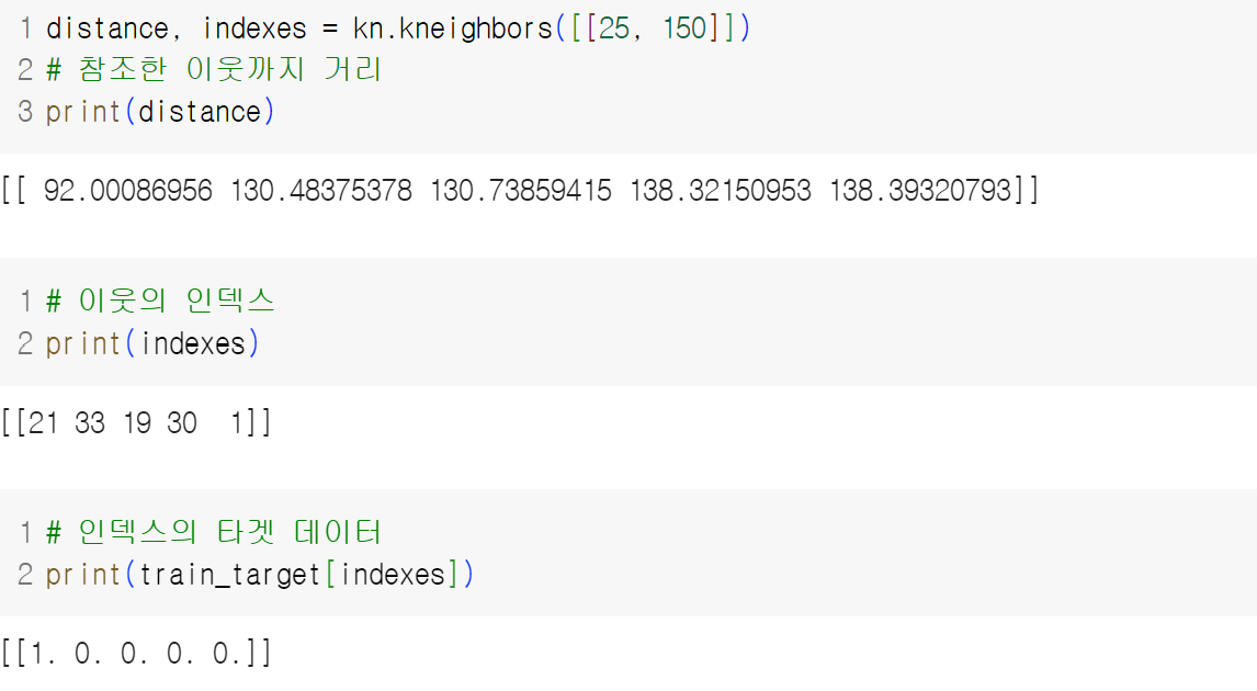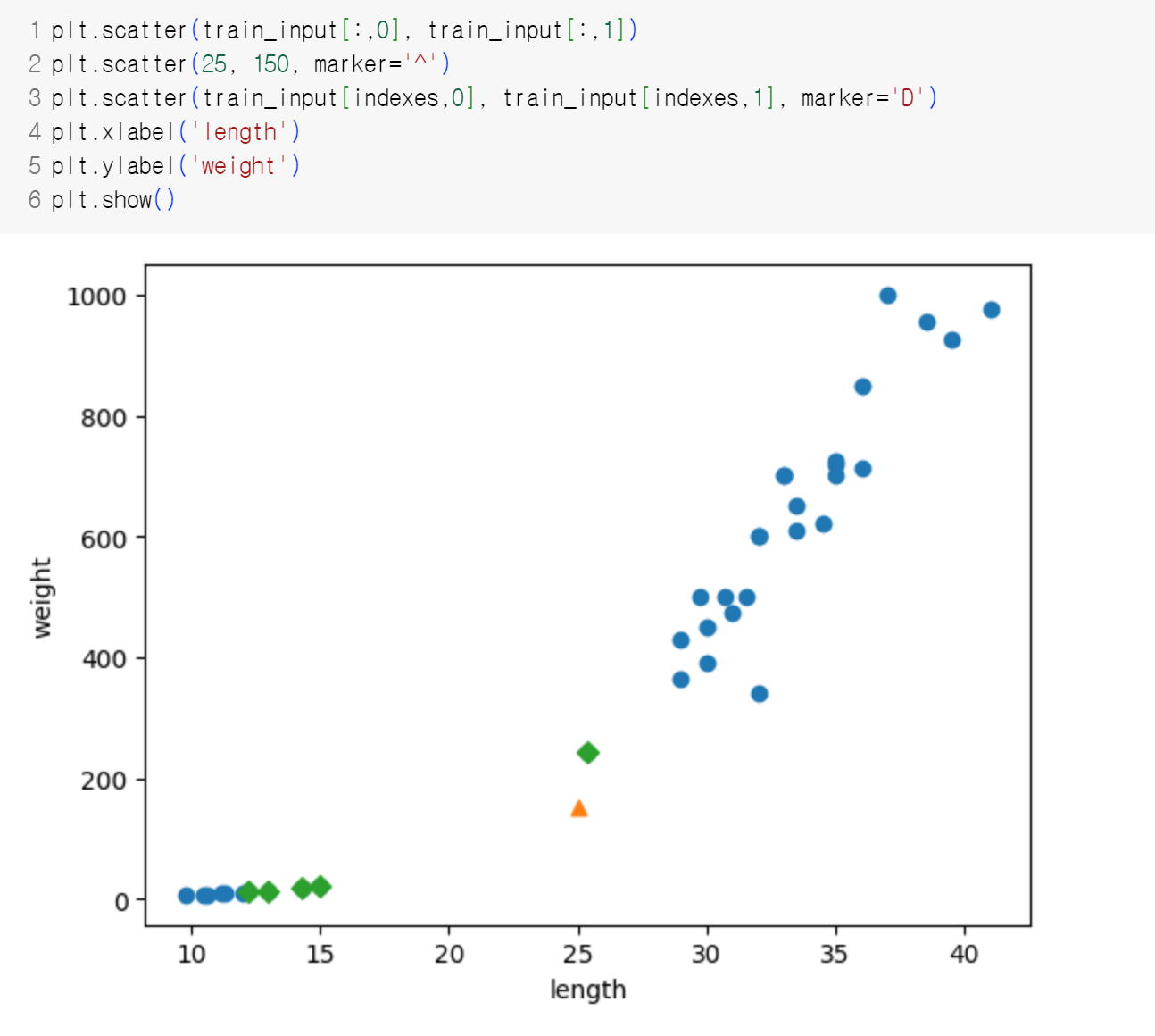 - 위의 삼각형 [25, 150]의 데이터는 오른쪽 도미에 가깝지만 [0] 빙어로 분류했다. 삼각형은 4개의 빙어 데이터와 1개의 도미 데이터를 참조하여 빙어로 예측했다.