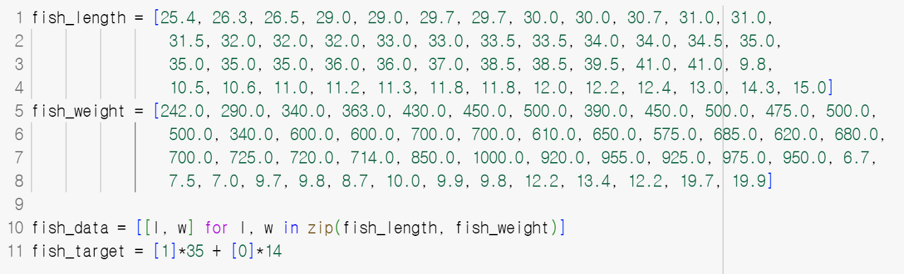- 스케일링한 데이터가 초록색 도미 데이터를 참조