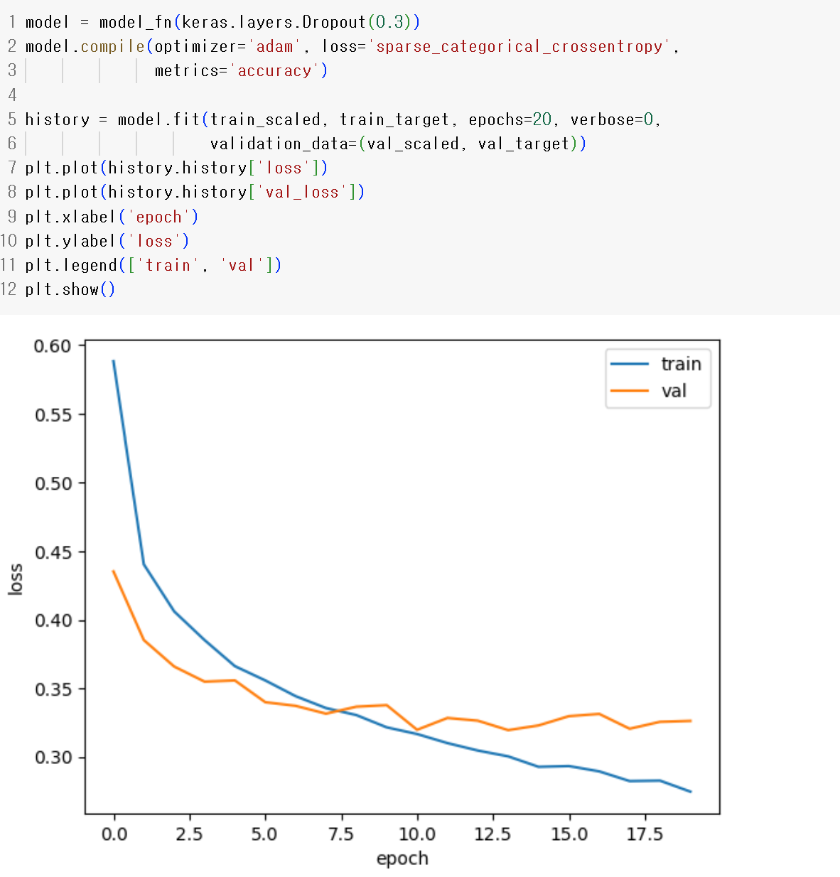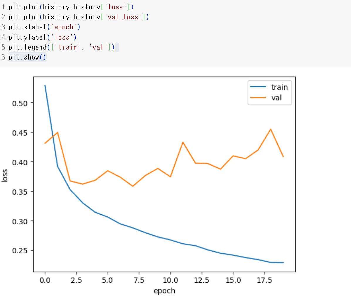 - loss 곡선이 train에서 감소하지만 val에서는 증가