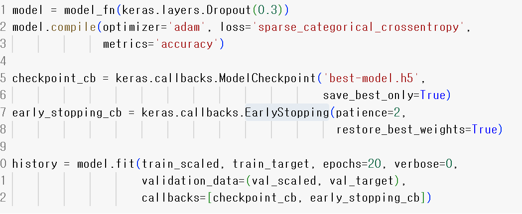 - EarlyStopping: 조기종료 과대적합 이전에 훈련을 미리 중지